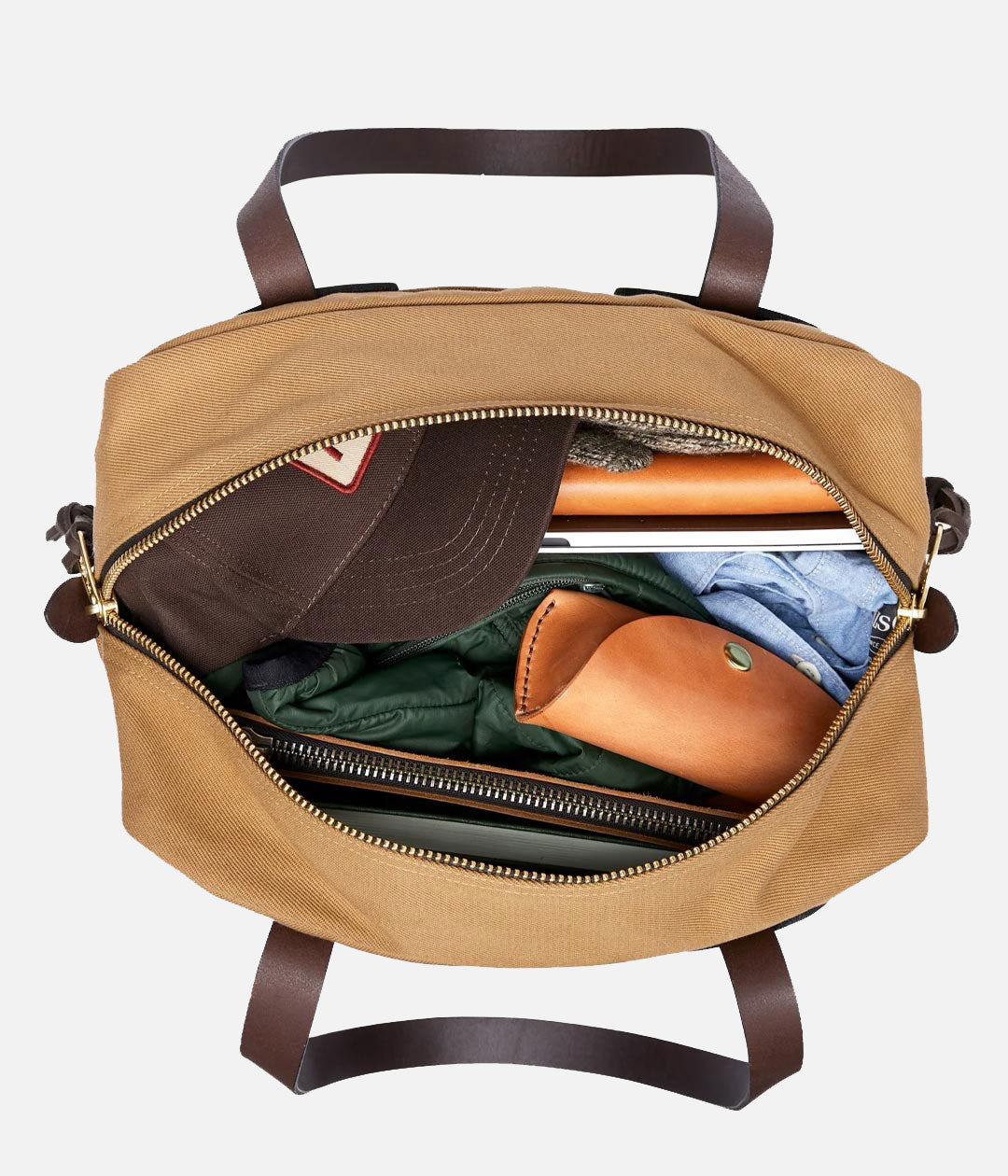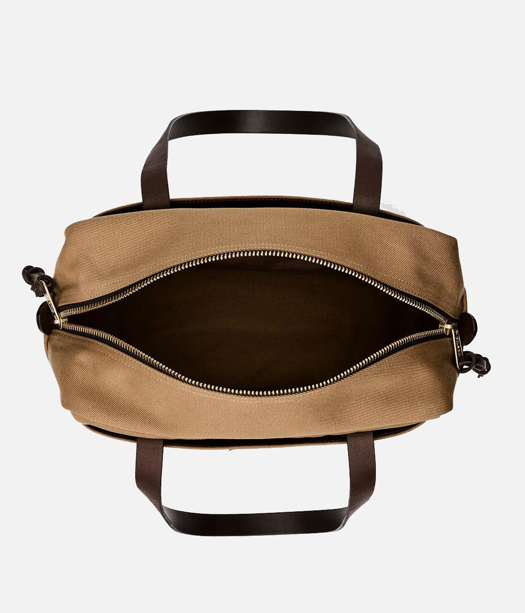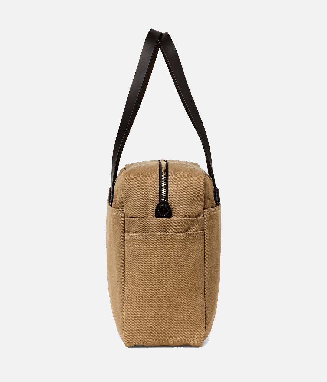 フィルソンのジップトートバッグ。made in USA。ジッパーがつくモデルで、重い荷物を肩から掛けて使用できるよう、ブライドルレザーのハンドルは長く設定されています。