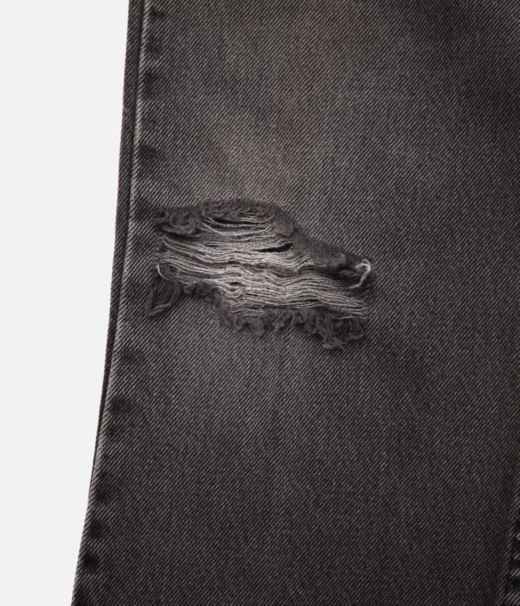 90年代に製造された40505。希少なアメリカ製。程よくテーパードしたシルエット。右膝に破れがありますが、あえてダメージを残しデザインとして着用して欲しい一本です。