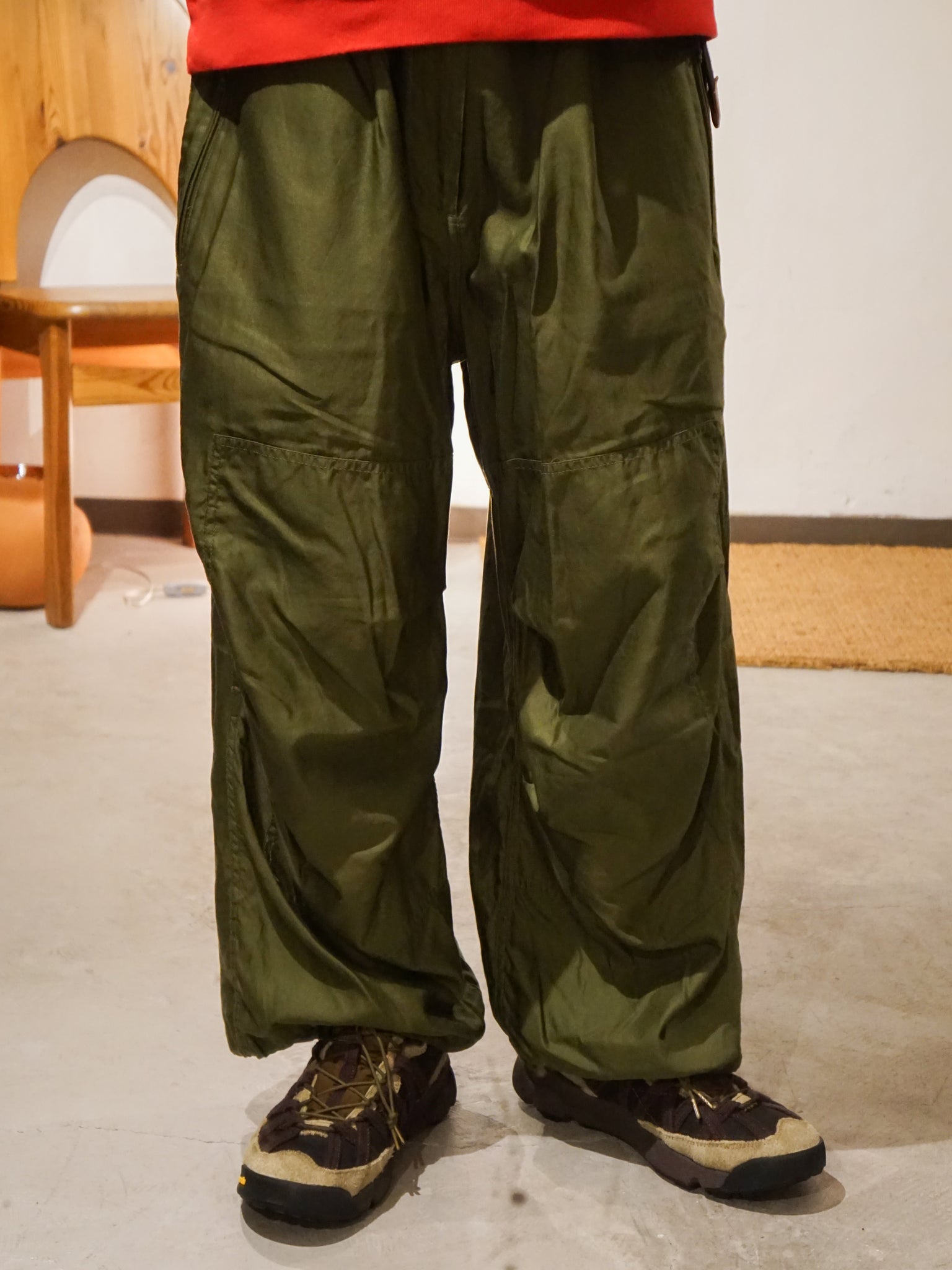 The wide, single-pleat silhouette evokes a military feel. The side pockets are zip-up, and the knees and hips are reinforced with fabric.
