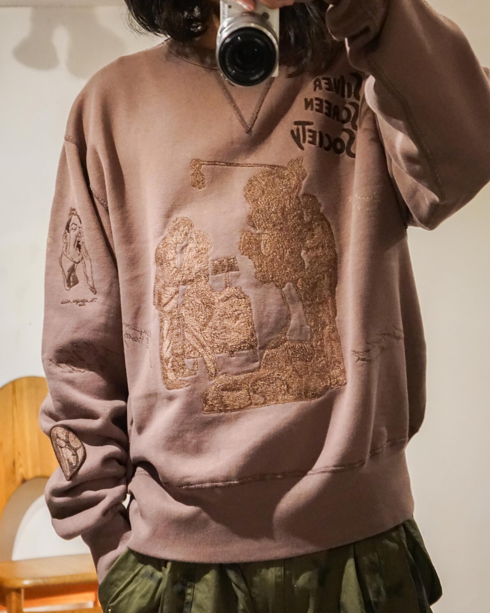 Film plays a major role in our designs, and we've made it a particularly prominent theme for this collection. Our film club, the Silver Screen Society, is at the heart of the designs. Each piece features embroidered fictional film posters, storyboard-style patches, and illustrations that commemorate the shared experience of watching movies. The embroidered colors are muted, evoking a silent film vibe, while also showcasing a range of tones beyond black and white. Within the collection, there are two styles: one with a tonal olive color scheme and the other with a tonal mauve color scheme.