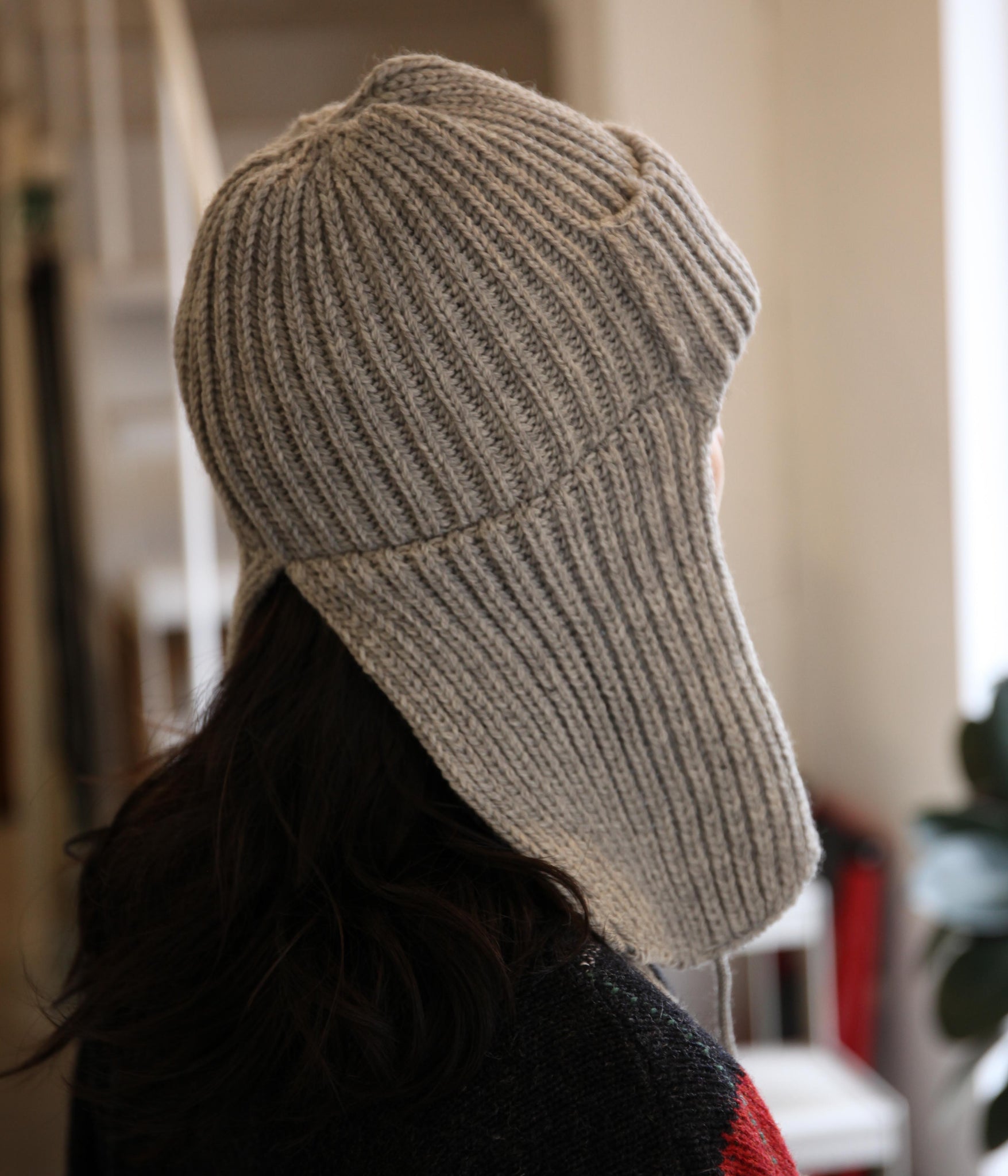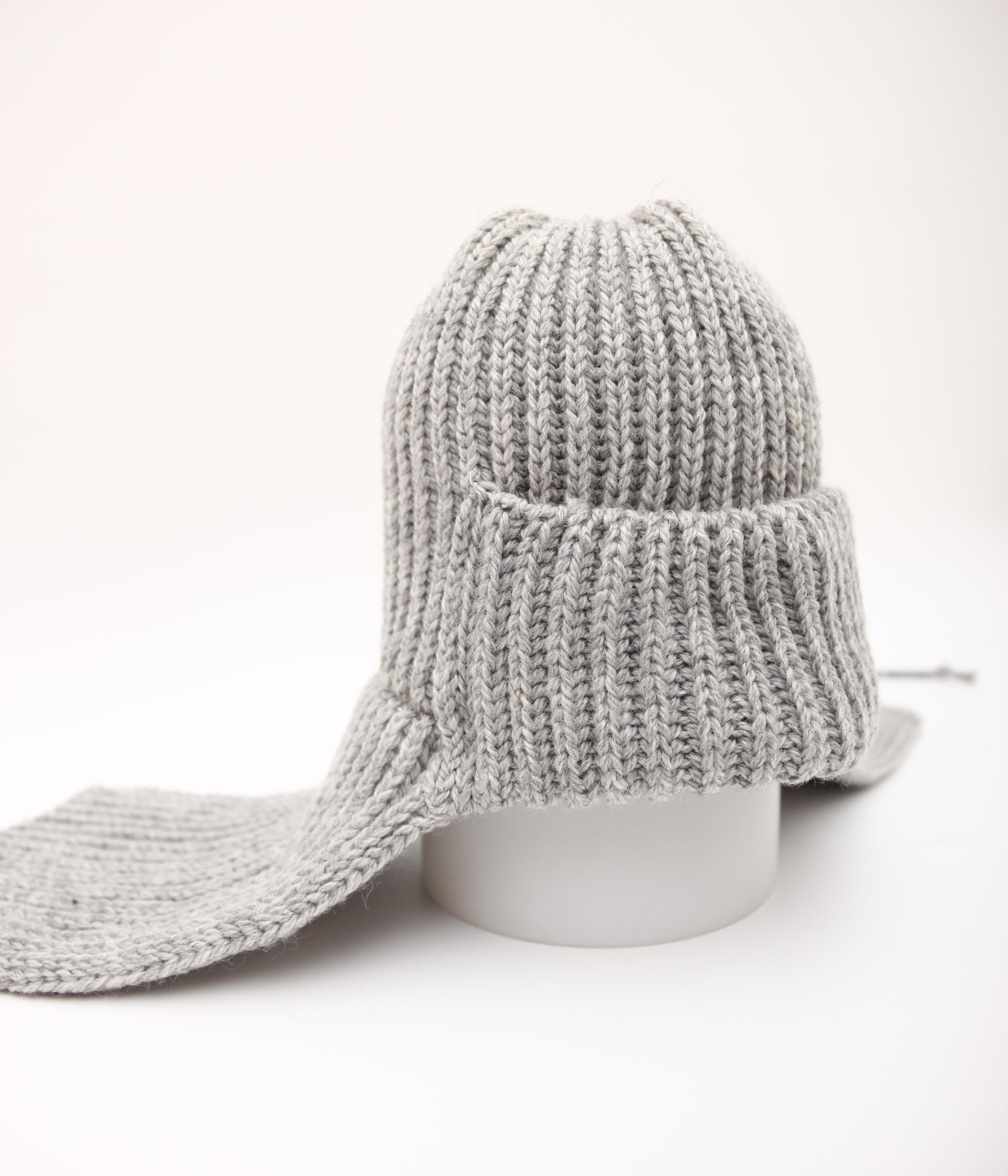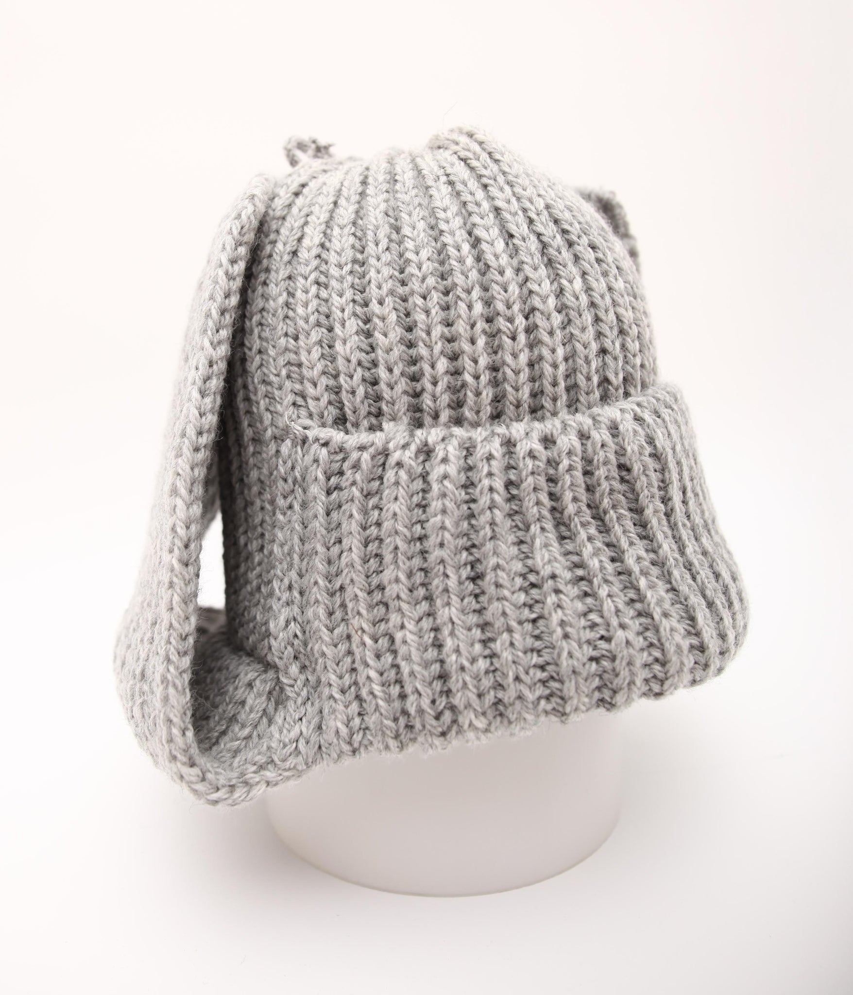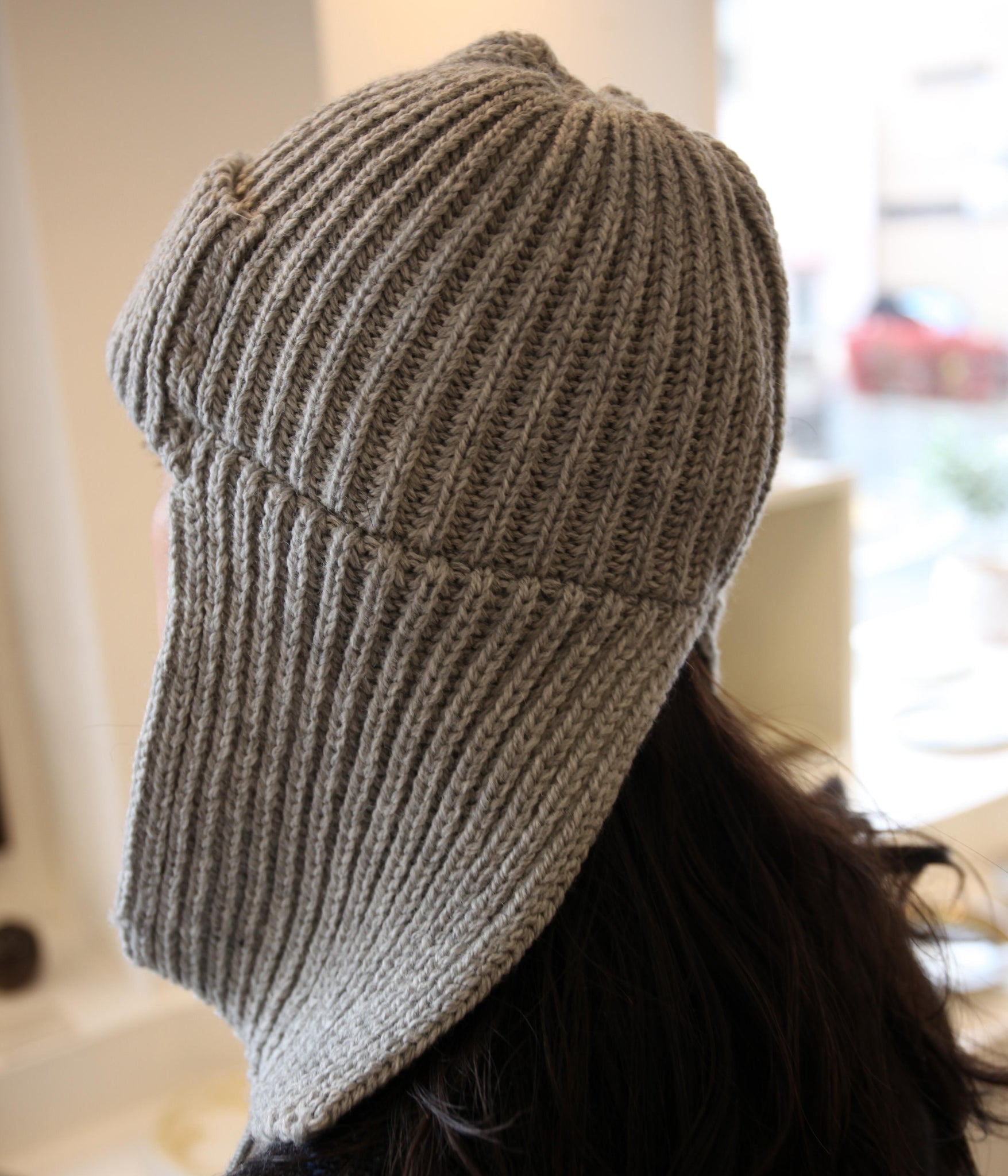 被り口の正面は折り返しのダブル仕様で、全体は厚みのあるリブ編みに仕立てています。伸縮性に優れており、頭の形に自然にフィットする快適な被り心地です。